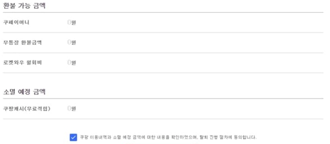 | 쿠팡 캐시 (소멸) | 모두 소멸 및 지급 예정 캐시는 지급되지 않음 | 탈퇴 전 반드시 모두 사용해야 손해 없음 |